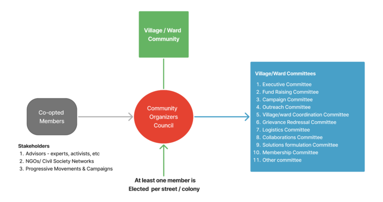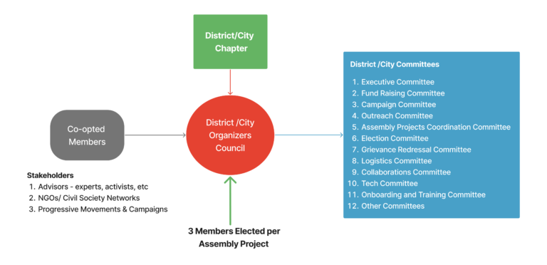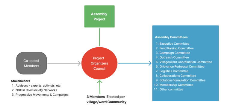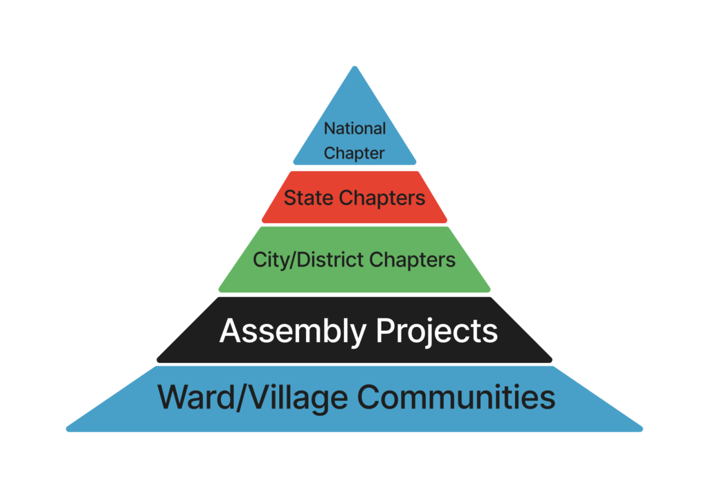 All the other upper units also can start as working groups and when the specified criteria of members are satisfied from at least 2/3rds of the units under the given unit. For example, an Assembly Project can start as a working group and transition into a full fledged unit when at least 2/3 rd of the Village/Ward Communities are active and have the capacity to elect the required 3 Members per Village/Ward Community.